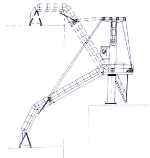 GW2登船梯配有多平台与升降机构,三角梯、前梯、主梯呈手臂状分布,有更大的适用范围,由缸推动梯子实现仰俯、伸缩、绳轮系统拉动平台升降,电机或液压马达推动回转支承带动平台在水平面±90°内作回转,适用于潮差较大的码头或5万吨以上的各种码头。(见下图)