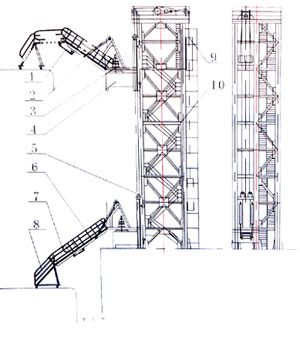 本登船梯综合了数家登船梯的优点,克服了现存各种设计的不足,其操作平稳、灵活,安全可靠,便于维修。