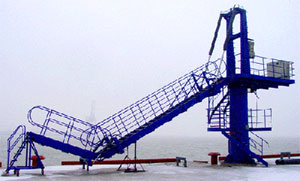 登船梯是现代各种大型码头在船舶停泊后,码头作业过程中,码头作业人员和船员安全顺利上下船舶的专用设备。对于5万吨级以上码头,油轮上自带舷梯难以形成岸与船的安全通道,因此登船梯成了大型码头不可缺少的关键设备。